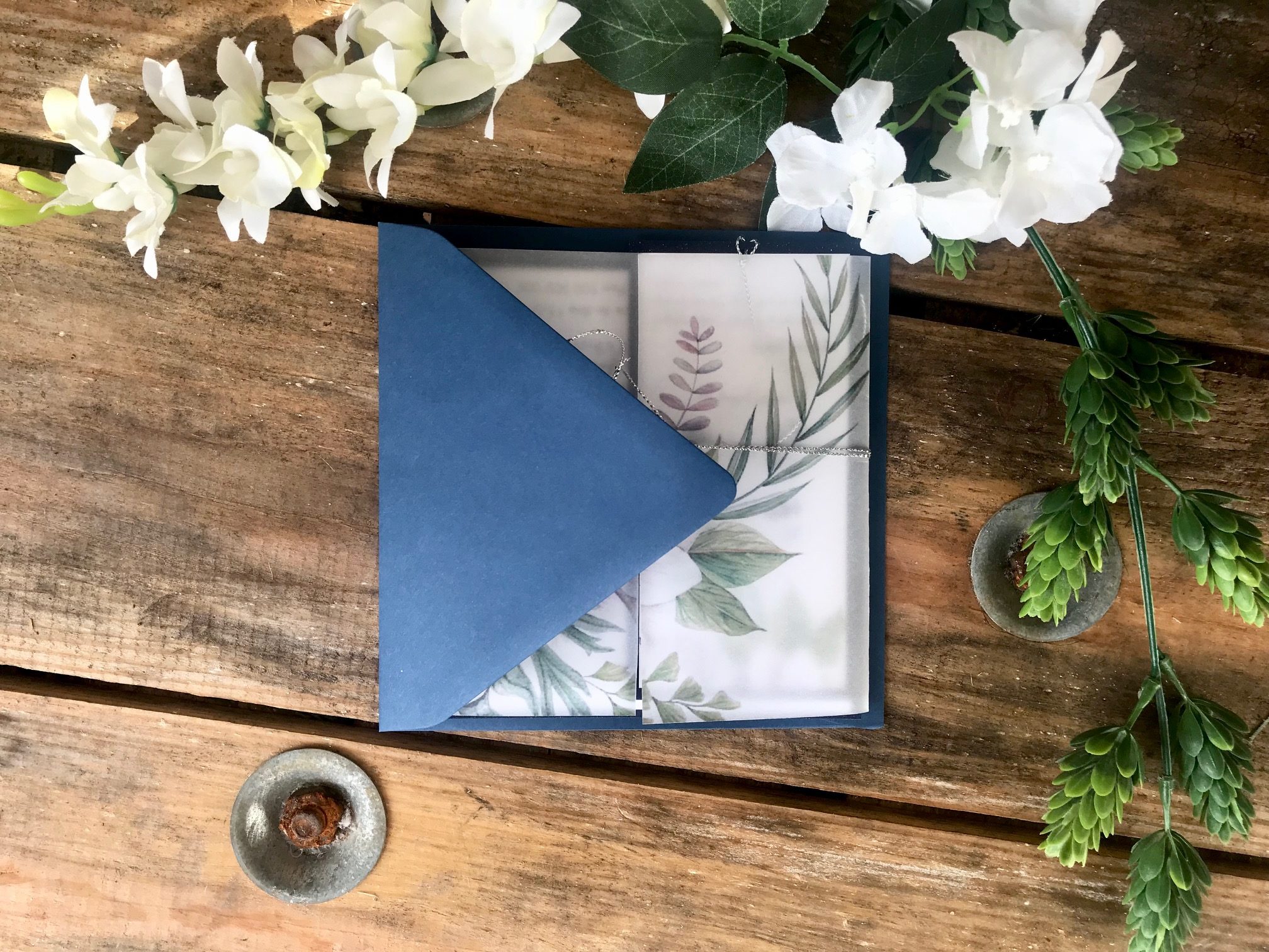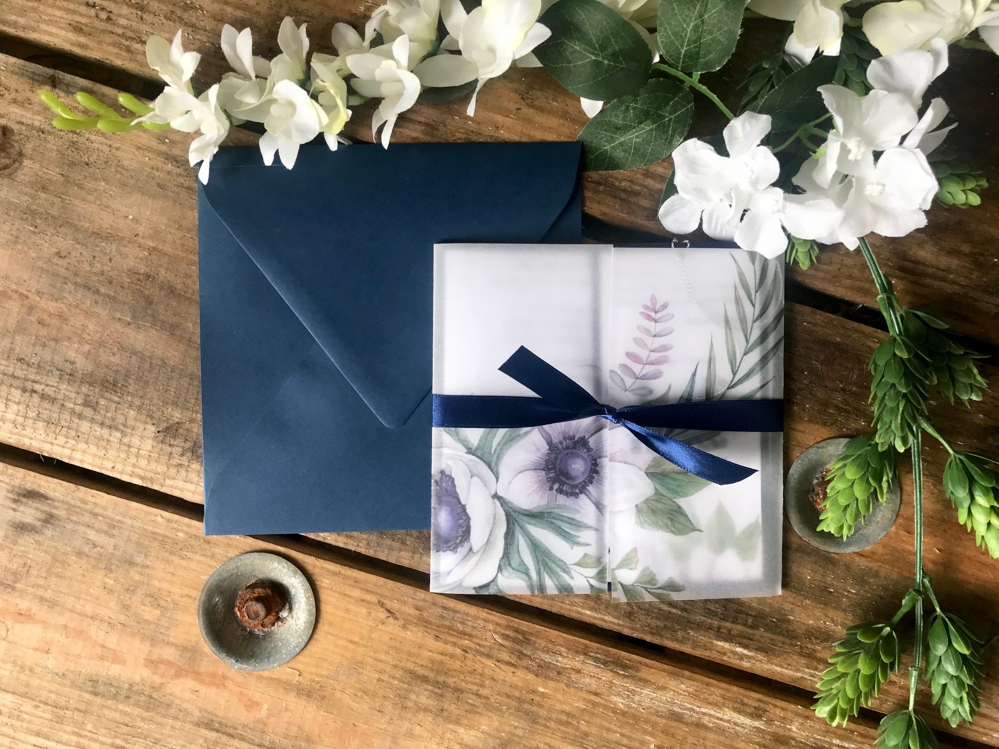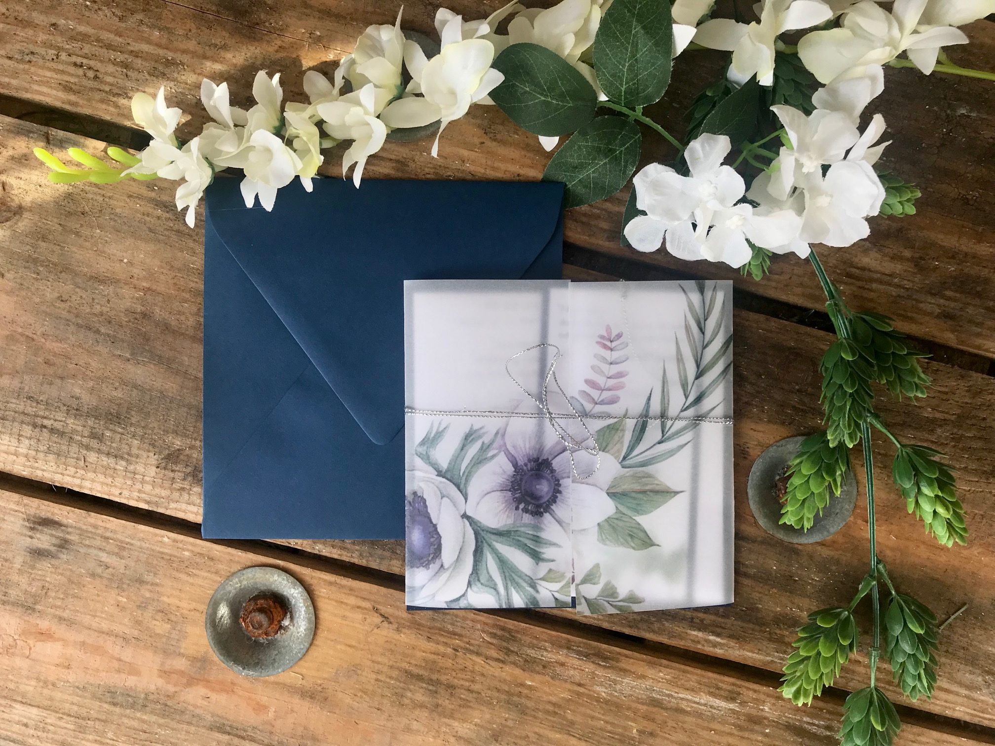 „Granatowe z kalką” to propozycja ręcznie wykonywanych zaproszeń, tworzonych z materiałów o najwyższym standardzie.