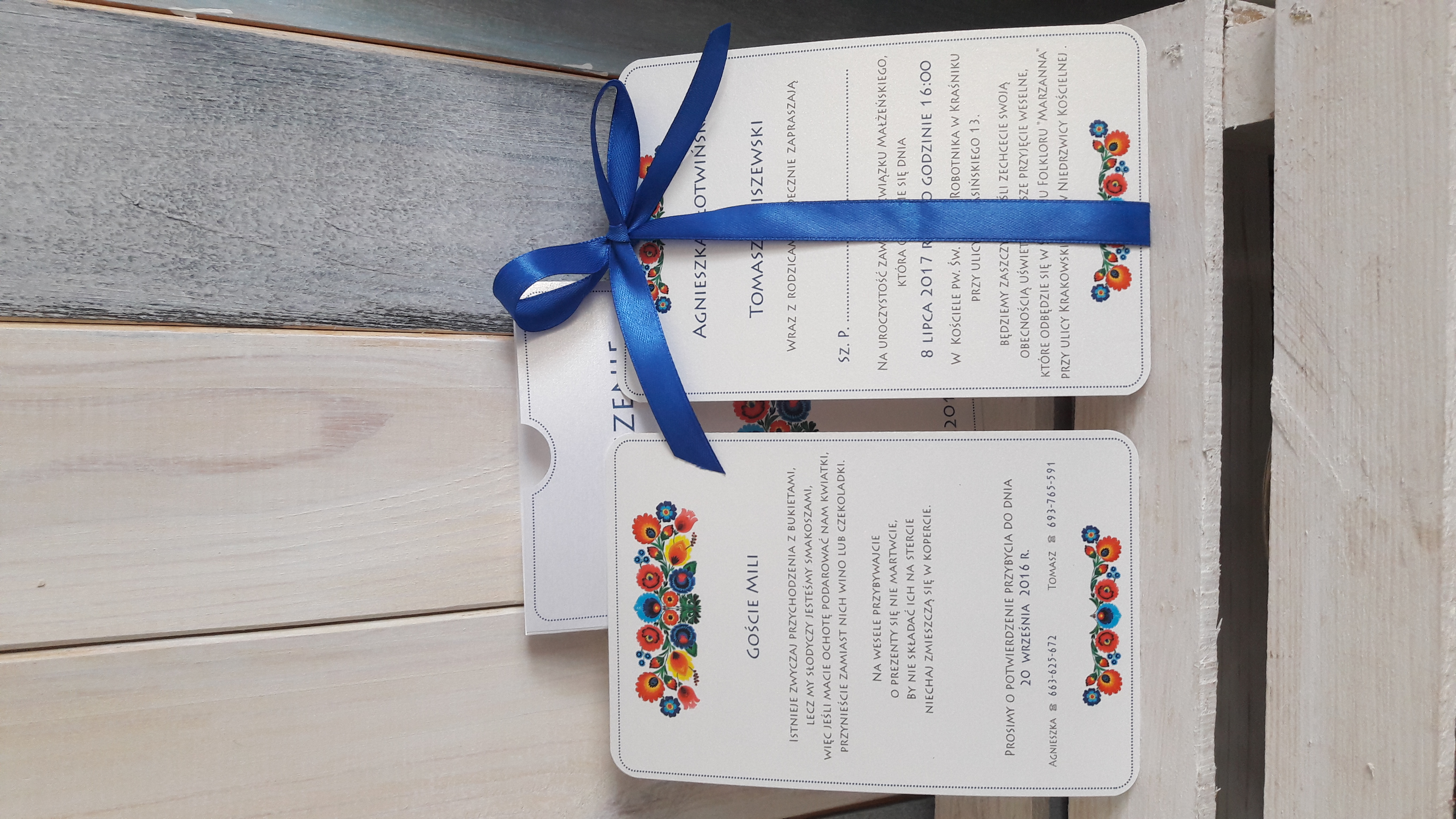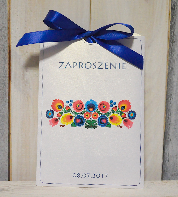 • Format: 17 x 12 cm, zaproszenie składa się z dwóch kart połączonych kokardką,
