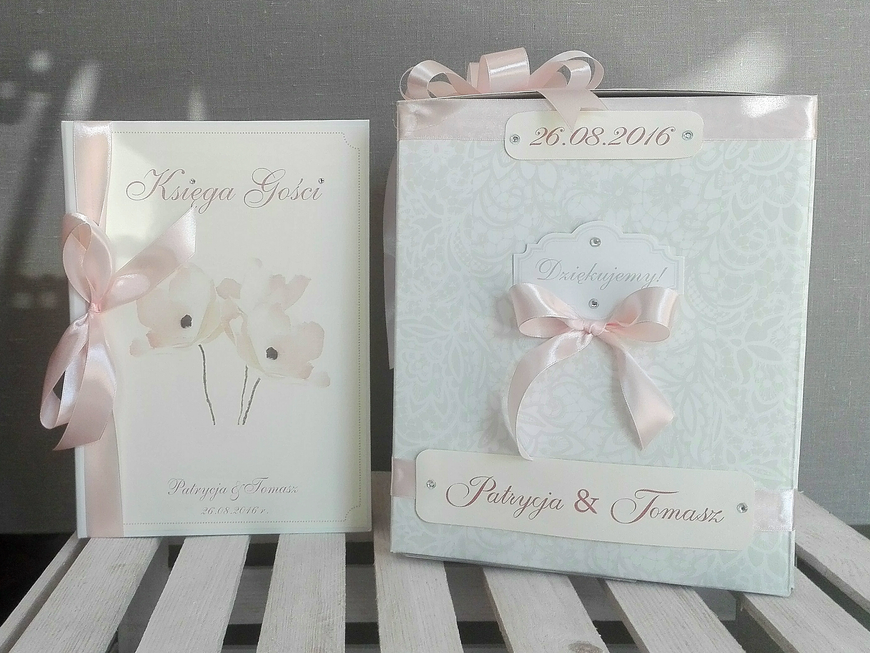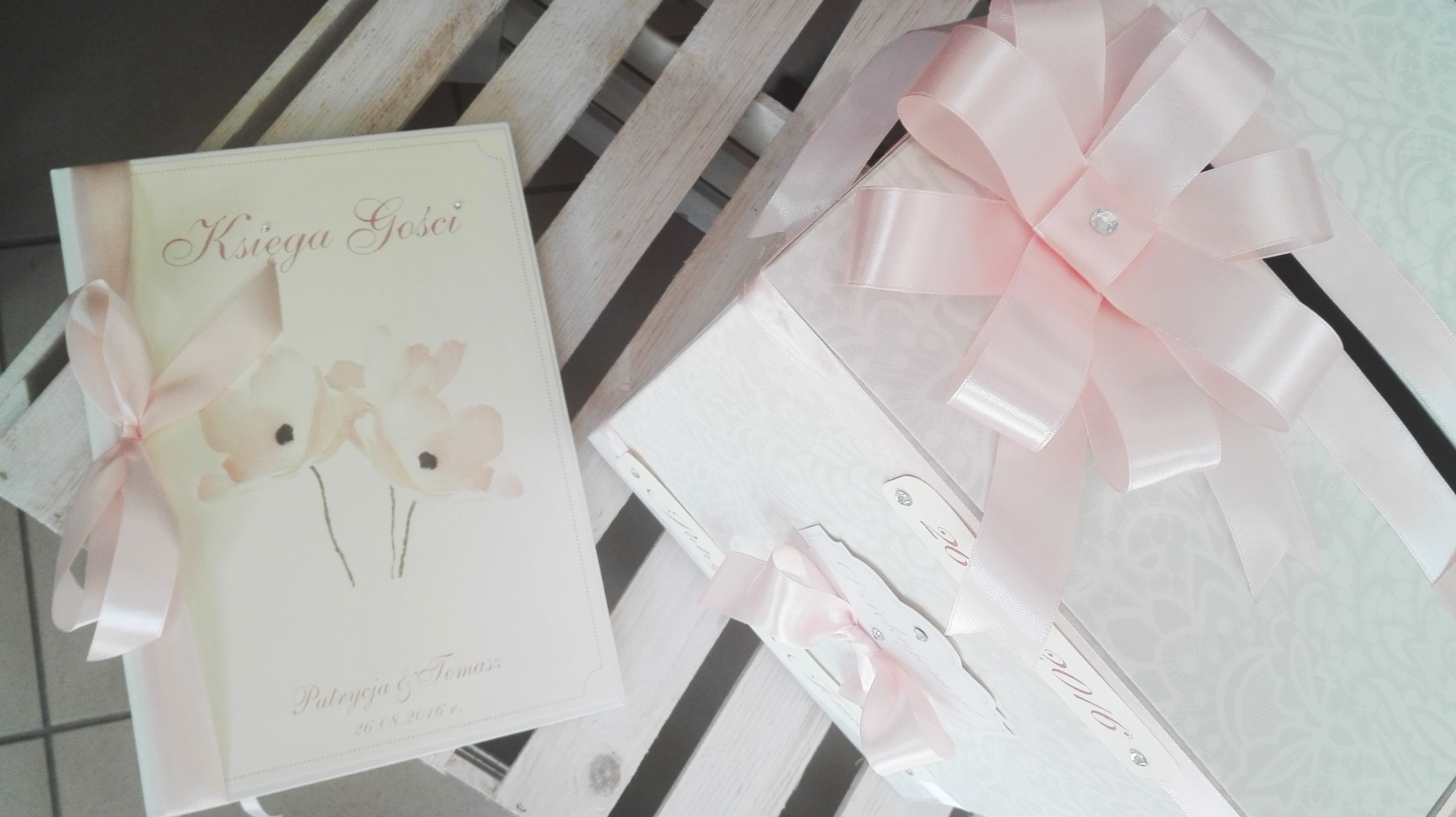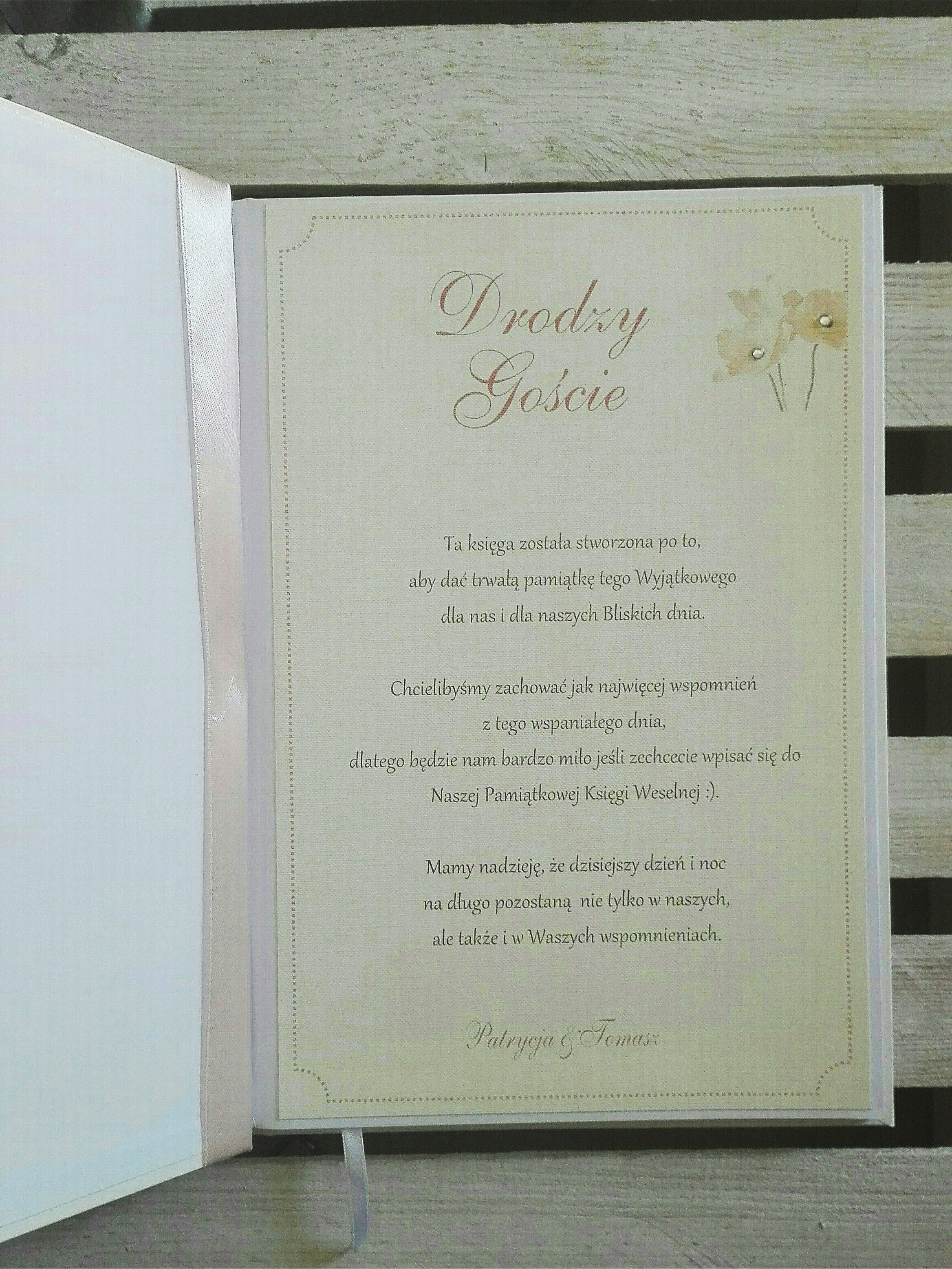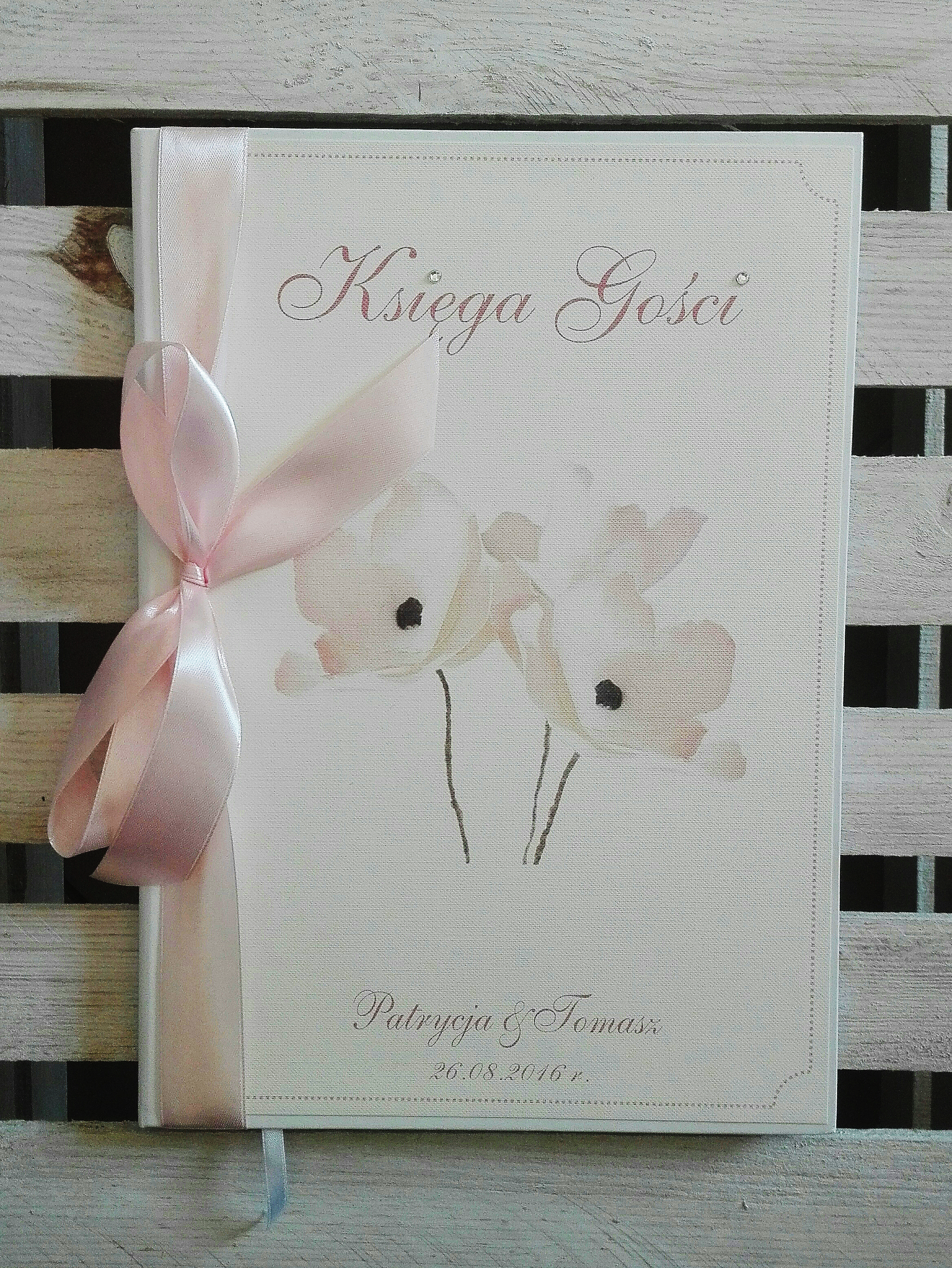 Księga Gości A4 pionowa na białej bazie z delikatną kwiatową grafiką oraz materiałową wstążką. Okładka oraz pierwsza strona Księgi jest personalizowana. Księga posiada 100 stron (50 kartek) i może zostać wykonana w wersji klasycznej lub w wersji ankiety w cenie 120 zł. Wersja z ankietą posiada jedną zadrukowaną stronę a drugą białą. Księga może stanowić kontynuację zaproszeń z kwiatowymi motywami. Z motywem Księgi możemy stworzyć również serię zaproszeń oraz dodatków ślubnych.