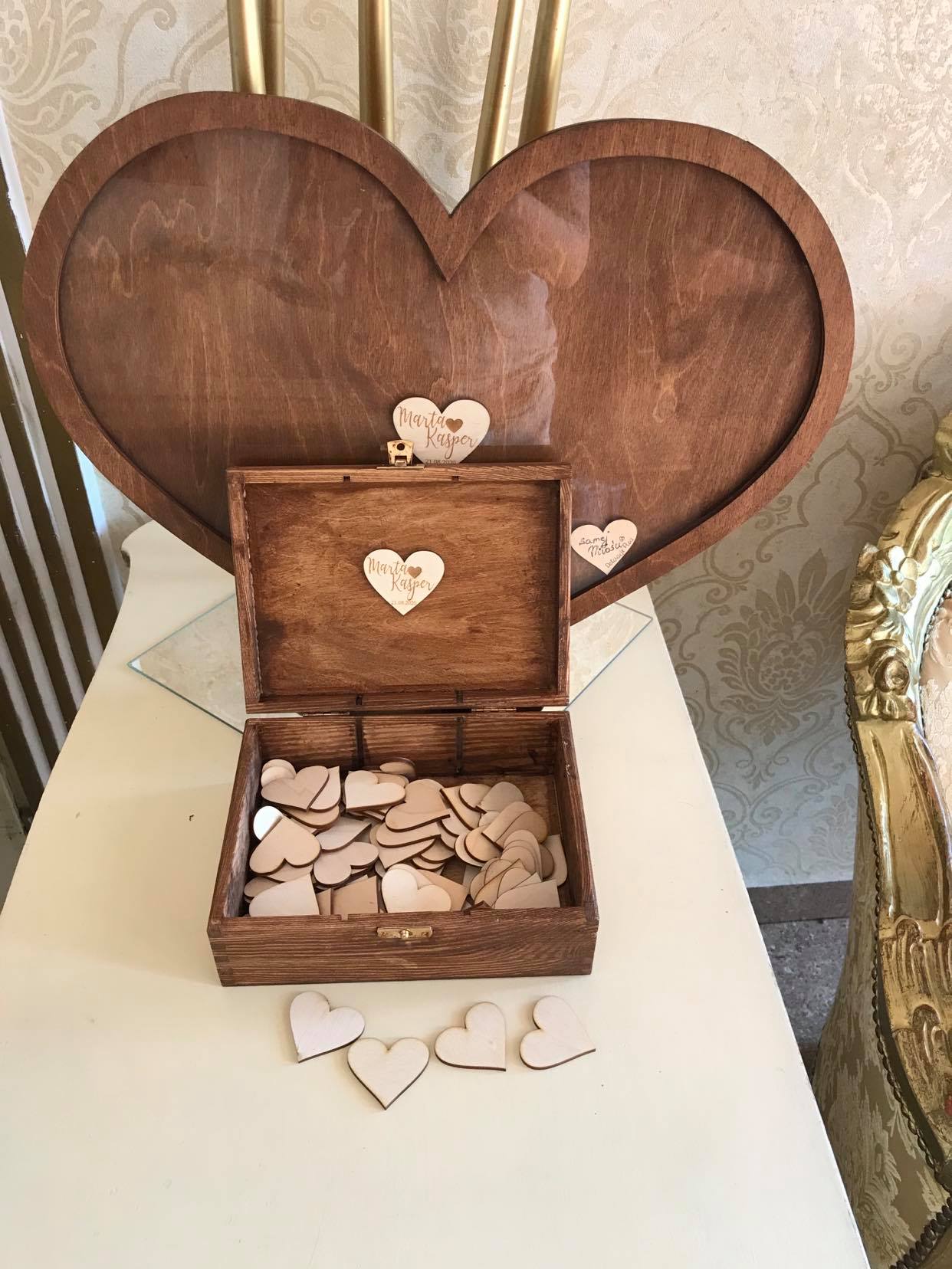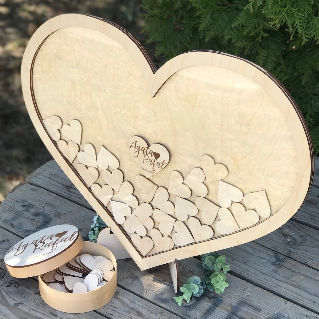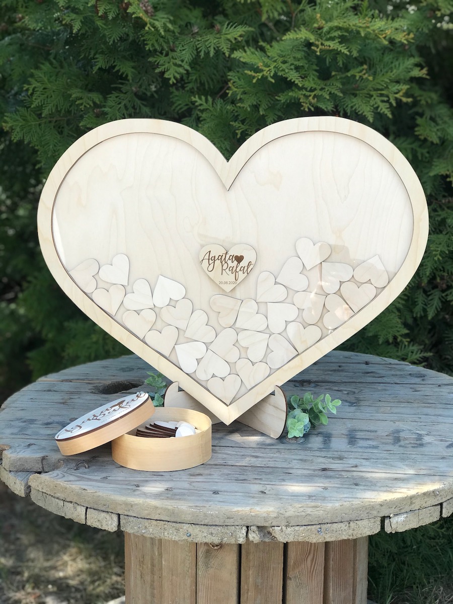 Księga gości z serduszkami do wrzucania wersja większa na 70 sztuk serduszek, naturalna sklejka.