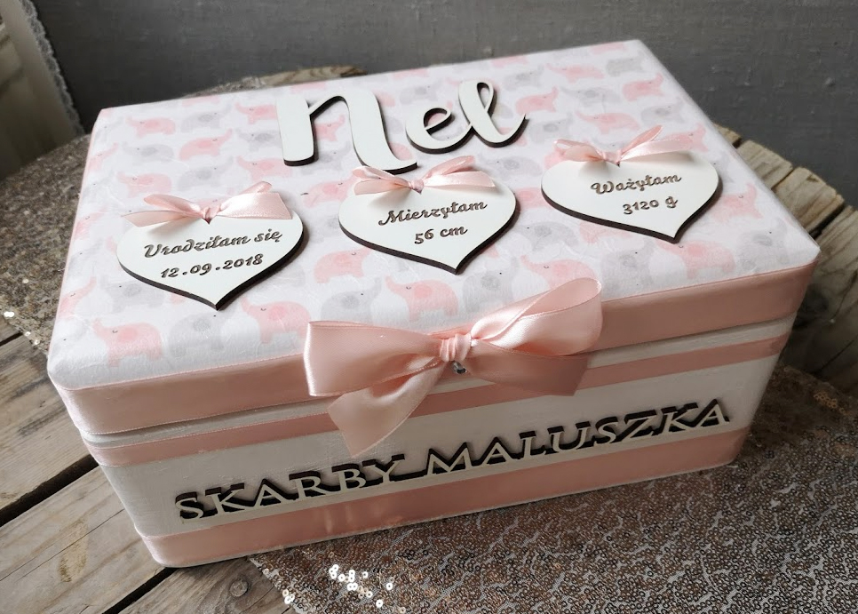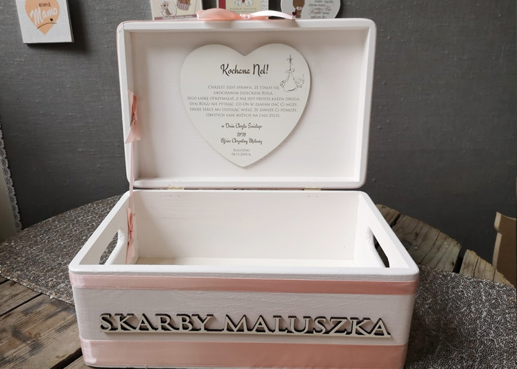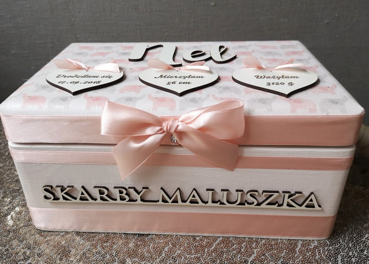 Ręcznie malowany z decoupage i drewnianymi napisami: możliwe imię dziecka, napis „Skarby Maluszka”, trzy serduszka z krótkimi napisami jak np. data urodzenia, wzrost, waga. Wewnątrz grawerowana dedykacja wg indywidualnych ustaleń!
