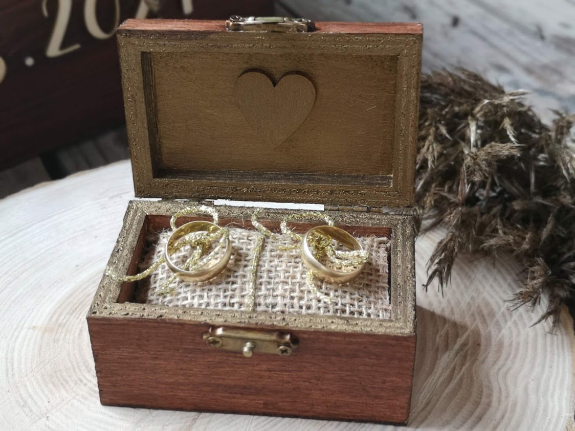 Drewniana szkatułka z poduszką na obrączki bejcowana na głęboki brąz z drewnianymi inicjałami