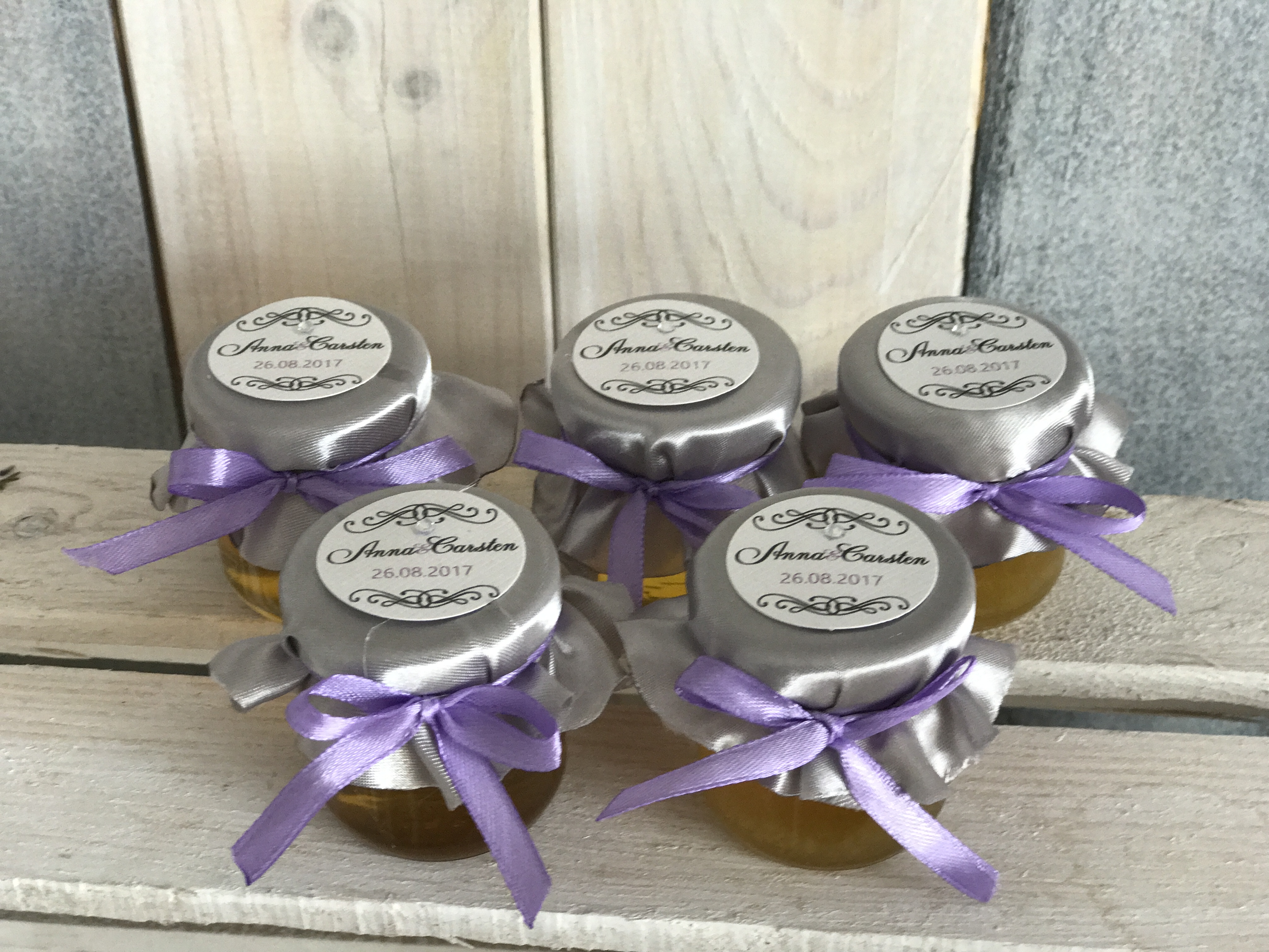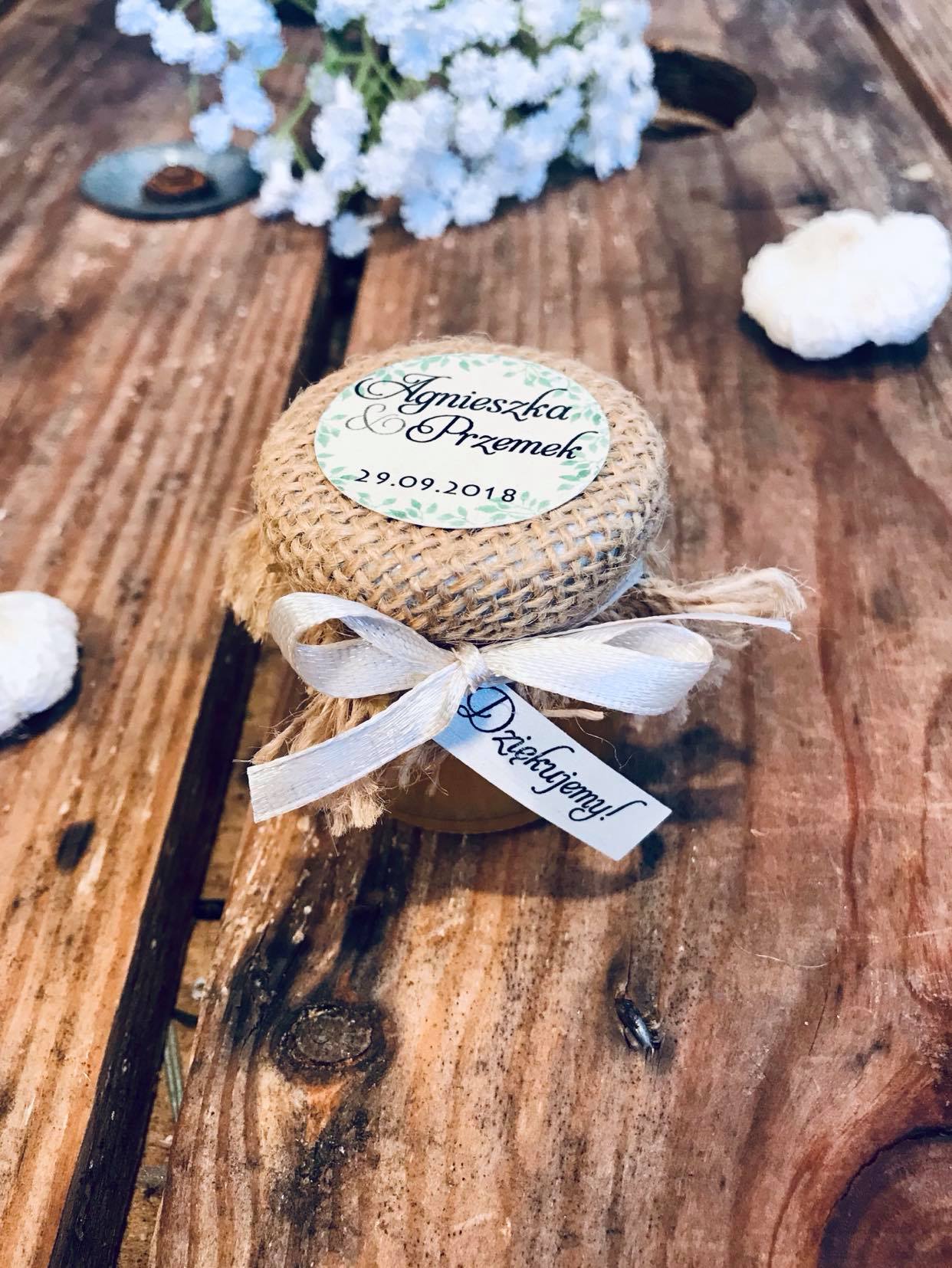 Miodki (sezonowe z certyfikatem pasieki) w słoiczkach z personalizacją o dowolnym projekcie: karteczka przywiązana do wstążeczki lub sznureczka, etykietka przyklejana i kółeczko na wieczko.