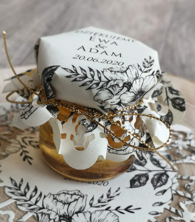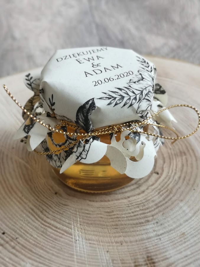 Miodki (sezonowe z certyfikatem pasieki) w słoiczkach z personalizacją o dowolnym projekcie drukowanym na wykrawanym papierze wiązane wstążeczką lub sznureczkiem (prosimy o podanie koloru)