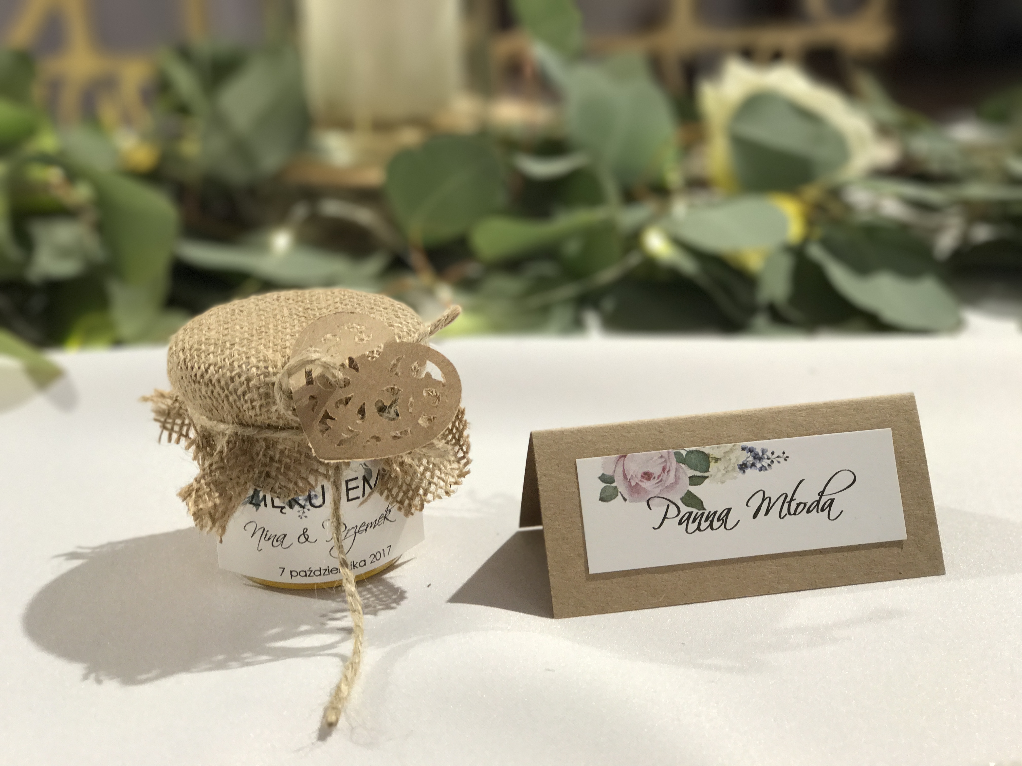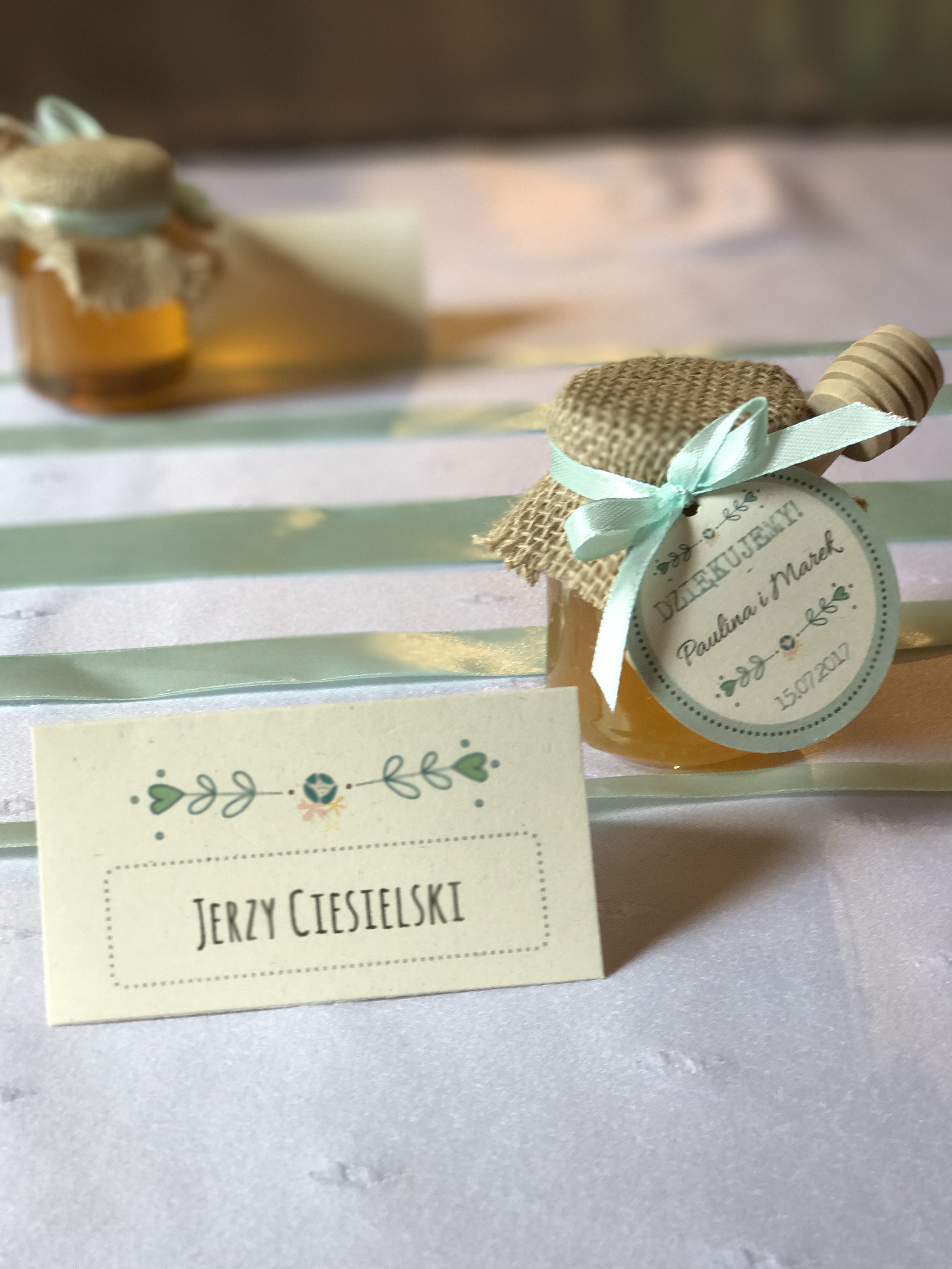 Miodki (sezonowe z certyfikatem pasieki) w słoiczkach z personalizacją o dowolnym projekcie: karteczka przywiązana do wstążeczki lub sznureczka, etykietka przyklejana i kółeczko na wieczko.