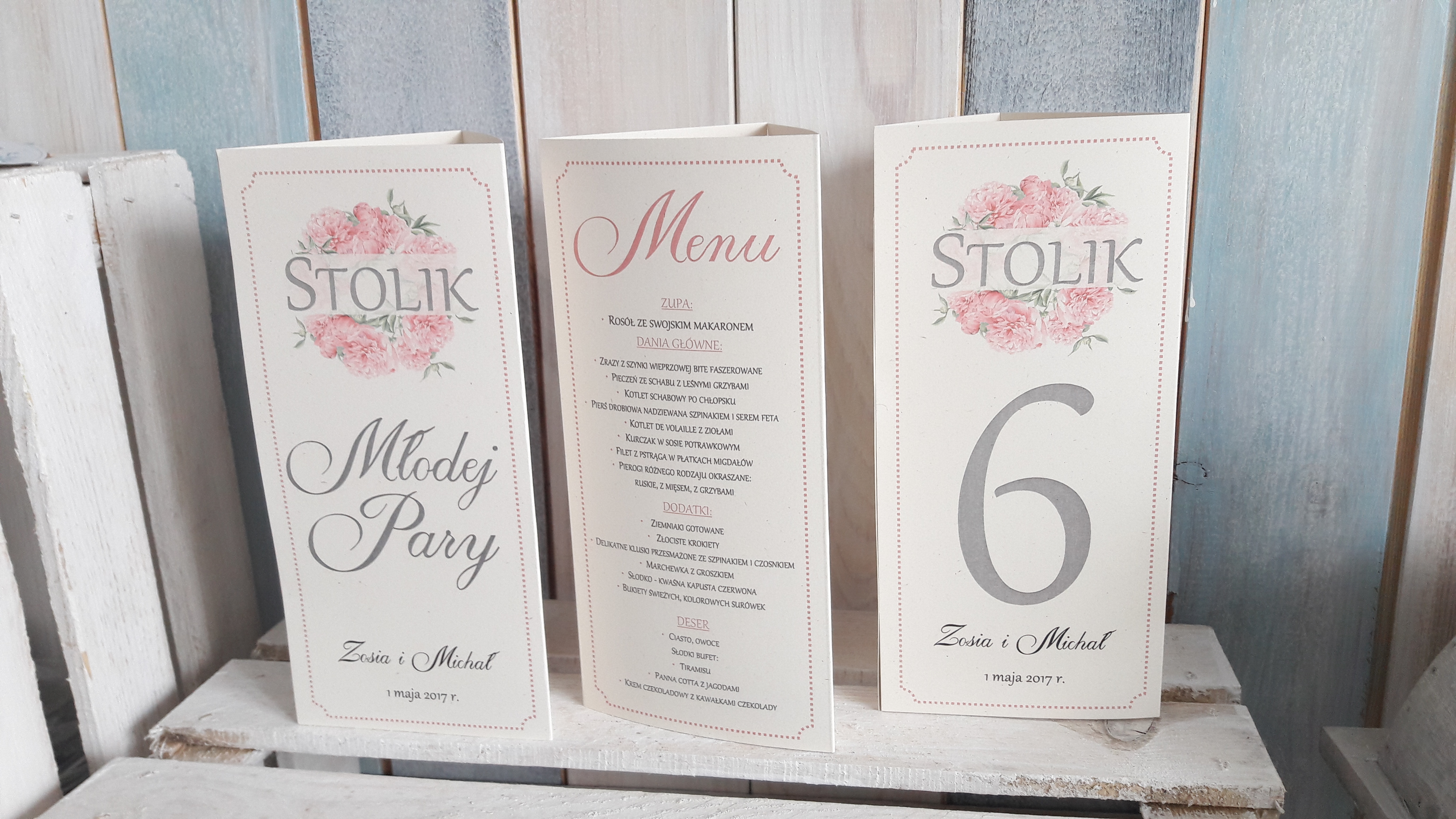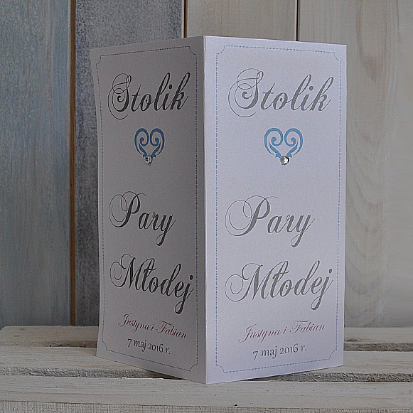 Tabliczka informacyjna dla gości z nr stołu, mamy tu 3 strony do dyspozycji, wielkość przed sklejeniem A4 po sklejeniu 3 ścianki DL. Na każdej ze stron może być inna informacja dla gości taka jak: Nr, Menu, lista osób. Aranżacja dowolna dopasowana do stylu zaproszeń, KG i dodatków.