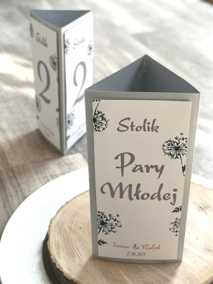 Tabliczka informacyjna dla gości z nr stołu, mamy tu 3 strony do dyspozycji, wielkość przed sklejeniem A4 po sklejeniu 3 ścianki DL. Na każdej ze stron może być inna informacja dla gości taka jak: Nr, Menu, lista osób. Aranżacja dowolna dopasowana do stylu zaproszeń, KG i dodatków.