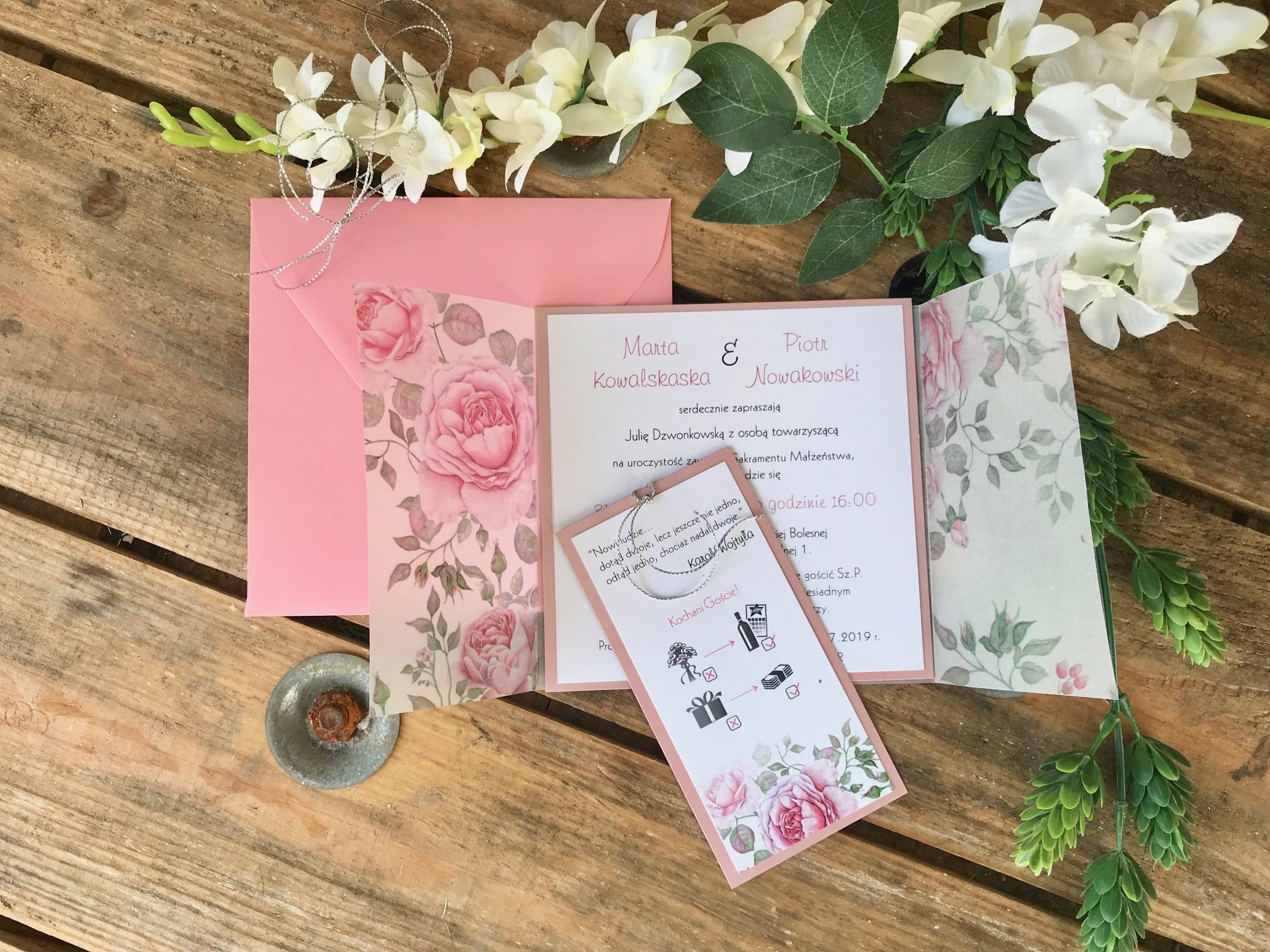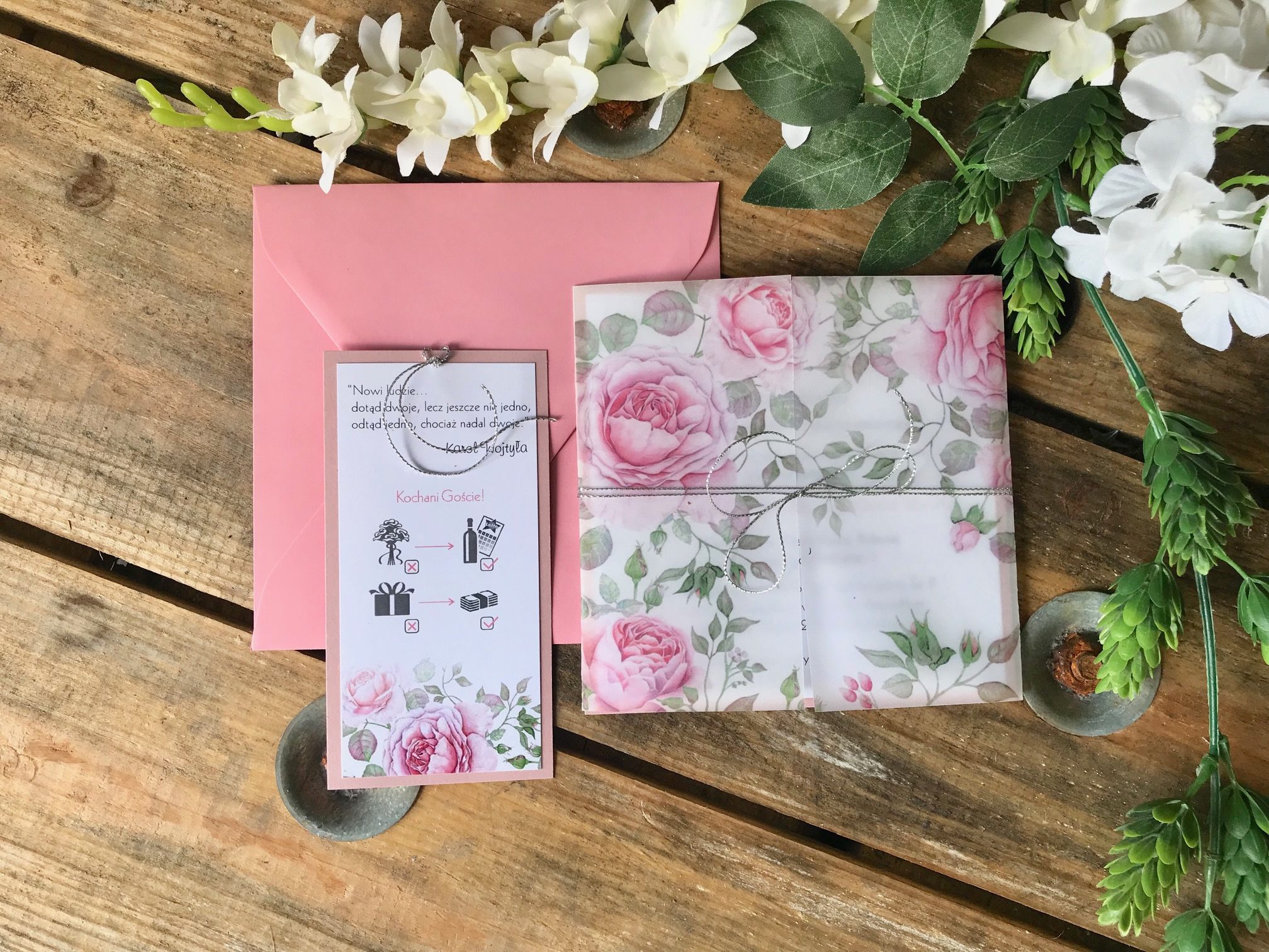 Wewnątrz owijki z kalki wiązanej sznureczkiem wg wzoru lub wstążką (tu należy dokonać wyboru) znajdują się 2 kartki z podkładką w kolorze paryskiego różu.