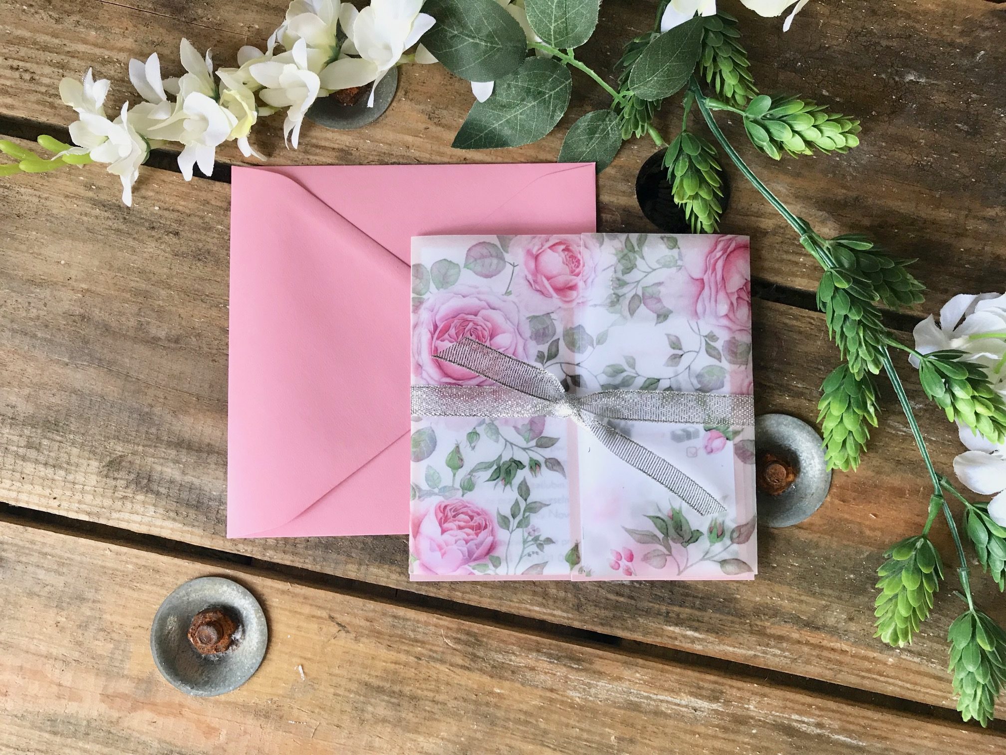 Piękne zaproszenie z kwiecistym wzorem drukowanym na kalce na tylnej stronie kalki inicjały.