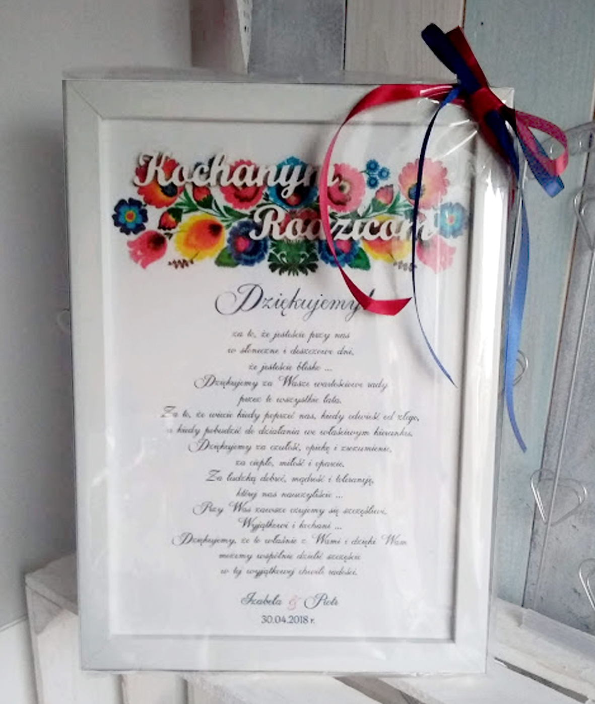 Ciekawa propozycja podziękowań dla Rodziców z Waszą treścią w drewnianej grubej ramce białej, personalizacją i datą, w dowolnej aranżacji tła, tak by pasowało do Waszego wesela i stylu.