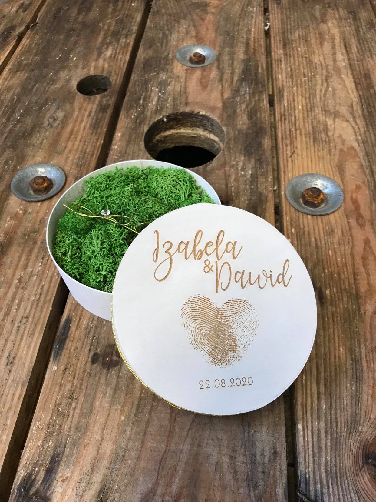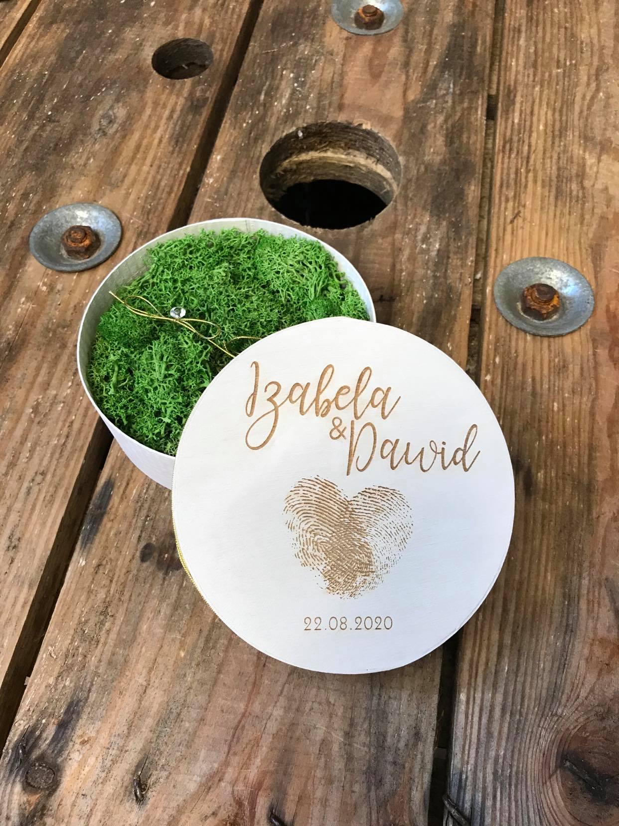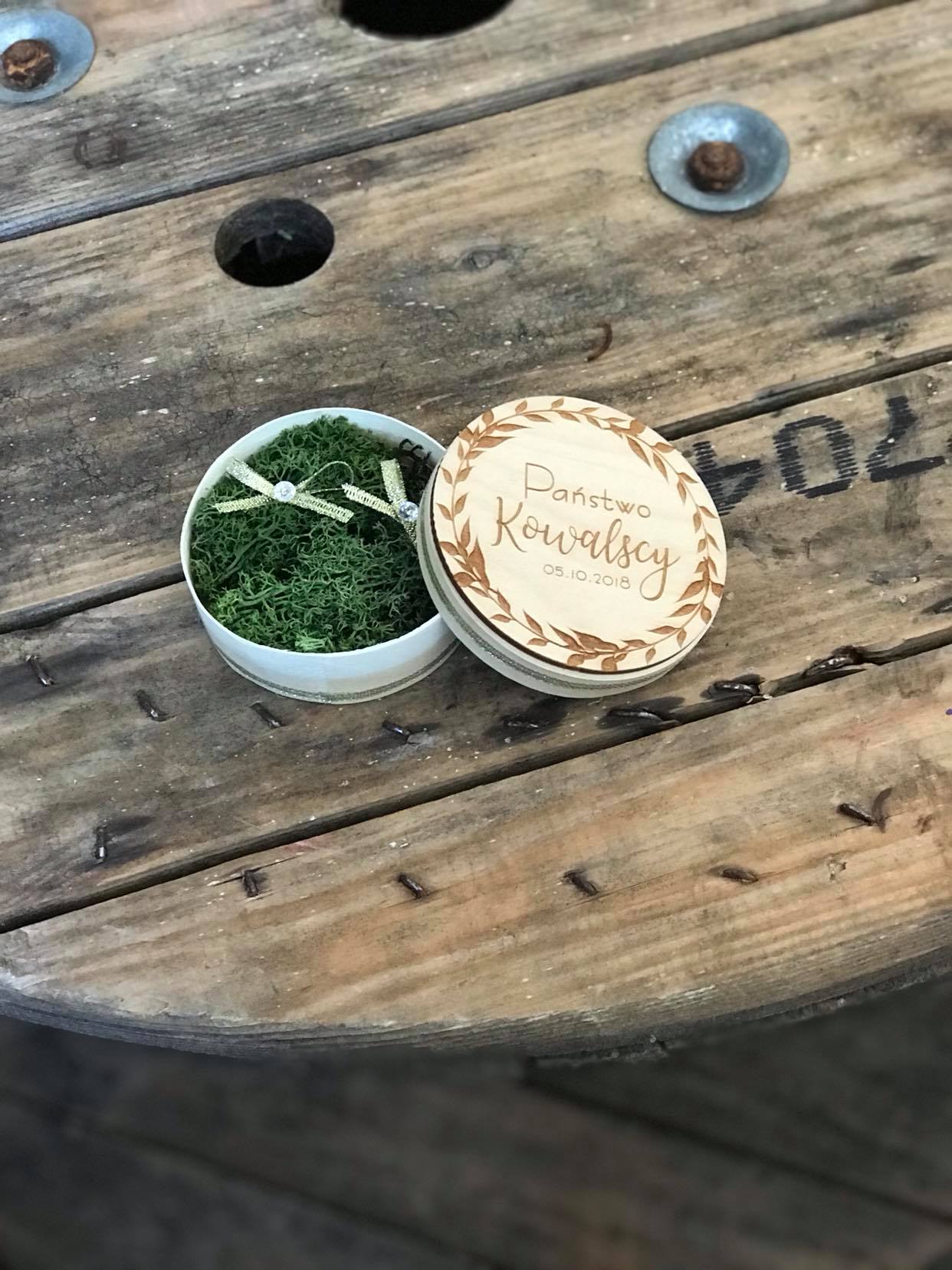 Drewniana szkatułka z mchem na obrączki w kolorze naturalnym z grawerem.