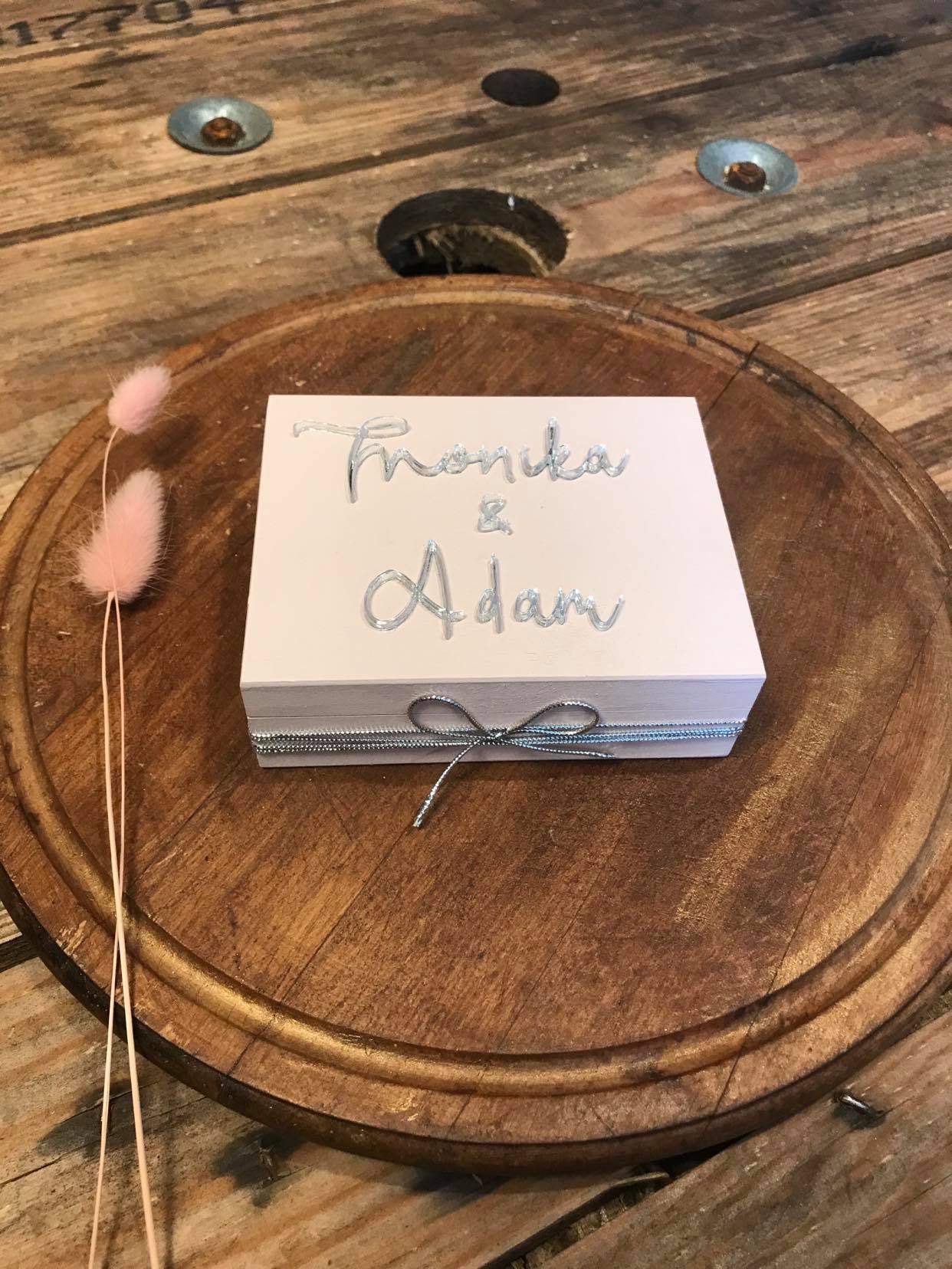Kolor pudełka do wyboru: biały, pudrowy, dusty-blue, butelkowa zieleń, bordo, naturalne drewno, ciemne drewno