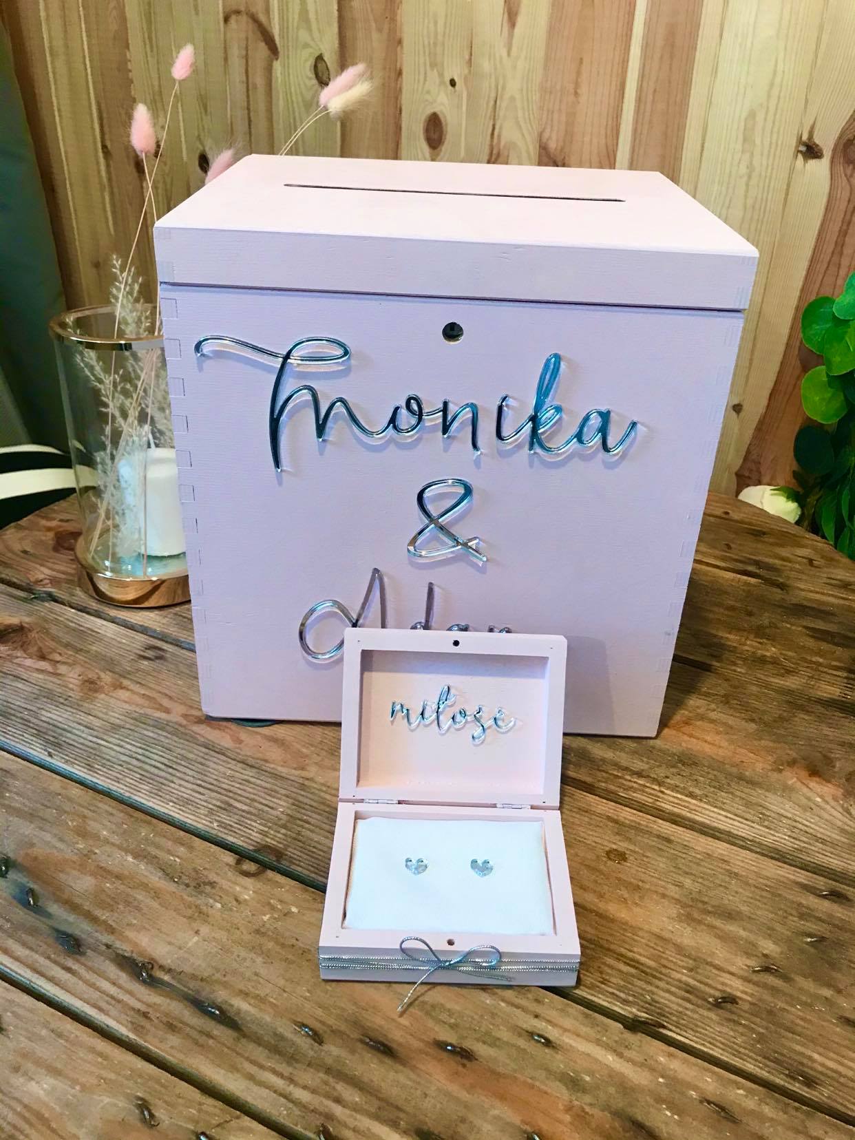 Szkatułka z imionami na froncie oraz napisem Miłość wewnątrz. Szkatułka z poduszkami w dwóch oddzielnych blokach. Obrączki układane na poduszce z matowym materiałem, przytrzymują je serduszka.
