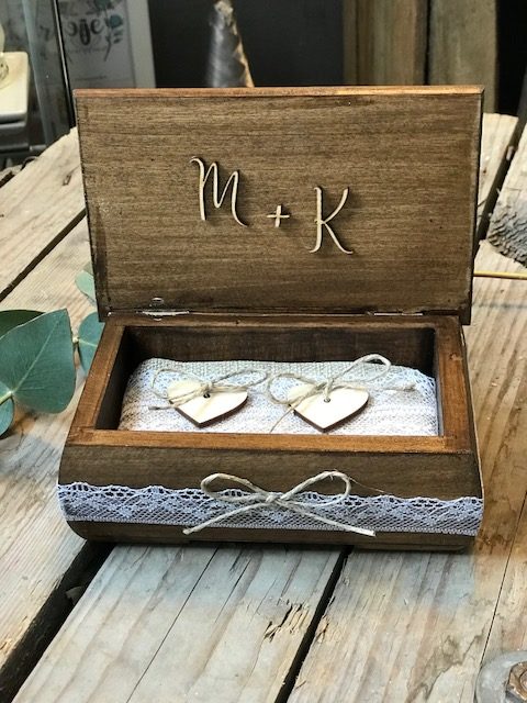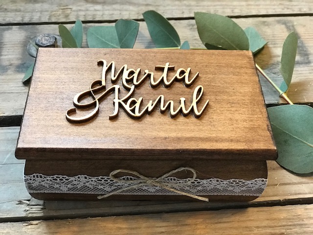 Drewniana szkatułka w kolorze orzechowym, z poduszką jutową i przestrzennymi imionami.
