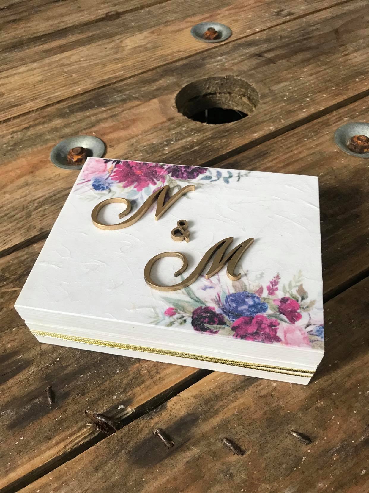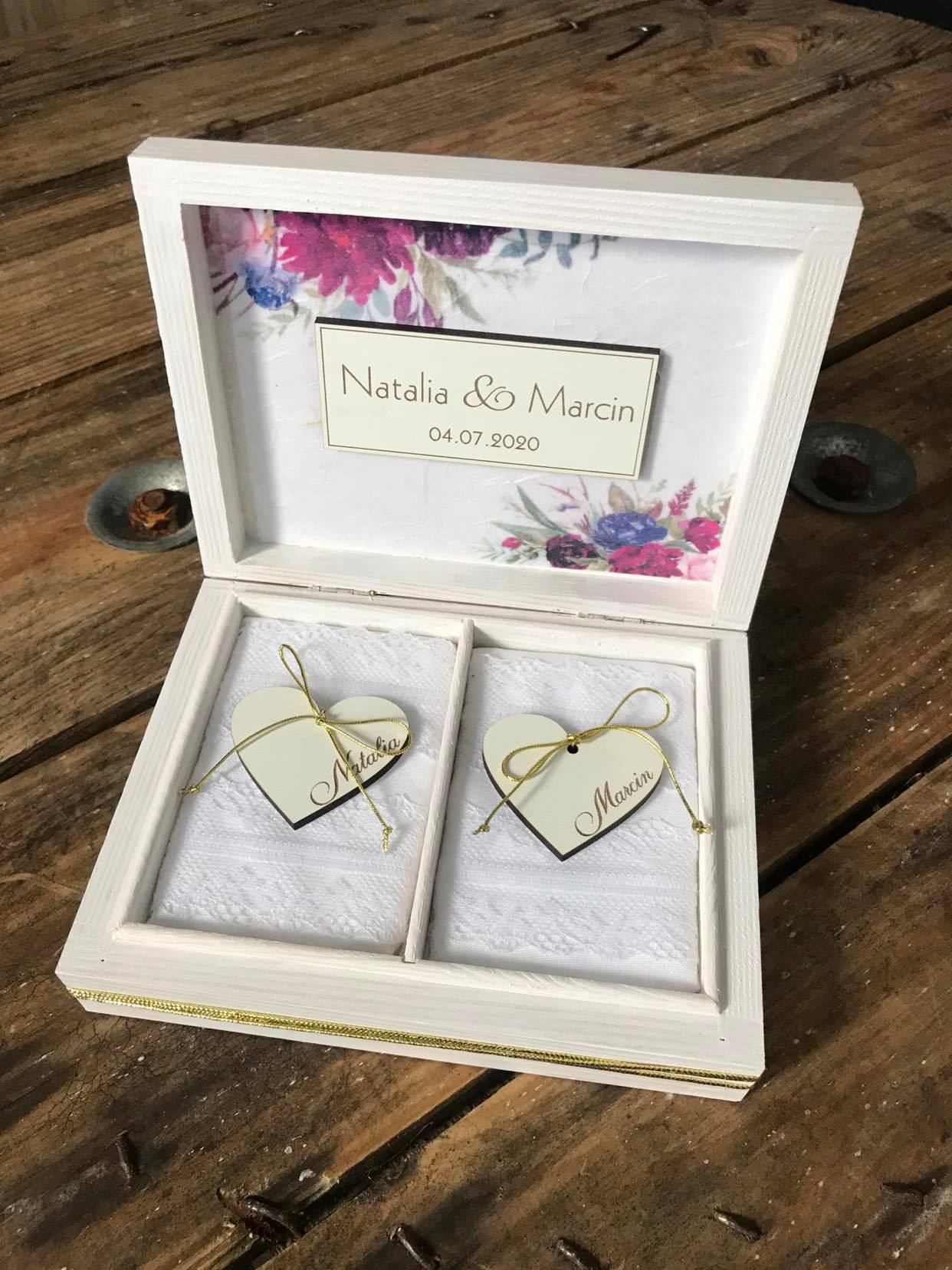 Szkatułka z imionami i datą na froncie oraz imionami wewnątrz, ozdabiane decopagem. Szkatułka z poduszkami w dwóch oddzielnych blokach.