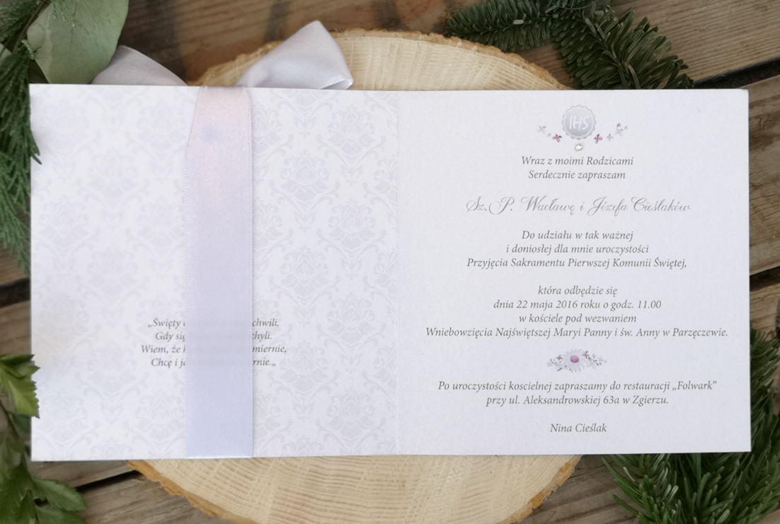 – projektujemy indywidualnie do każdego zaproszenia - wstążka o szerokości 25 mm, do wyboru z palety dostępnej w załączniku. Preferowane kolory do wzoru to biel, jasny róż, jasny fiolet