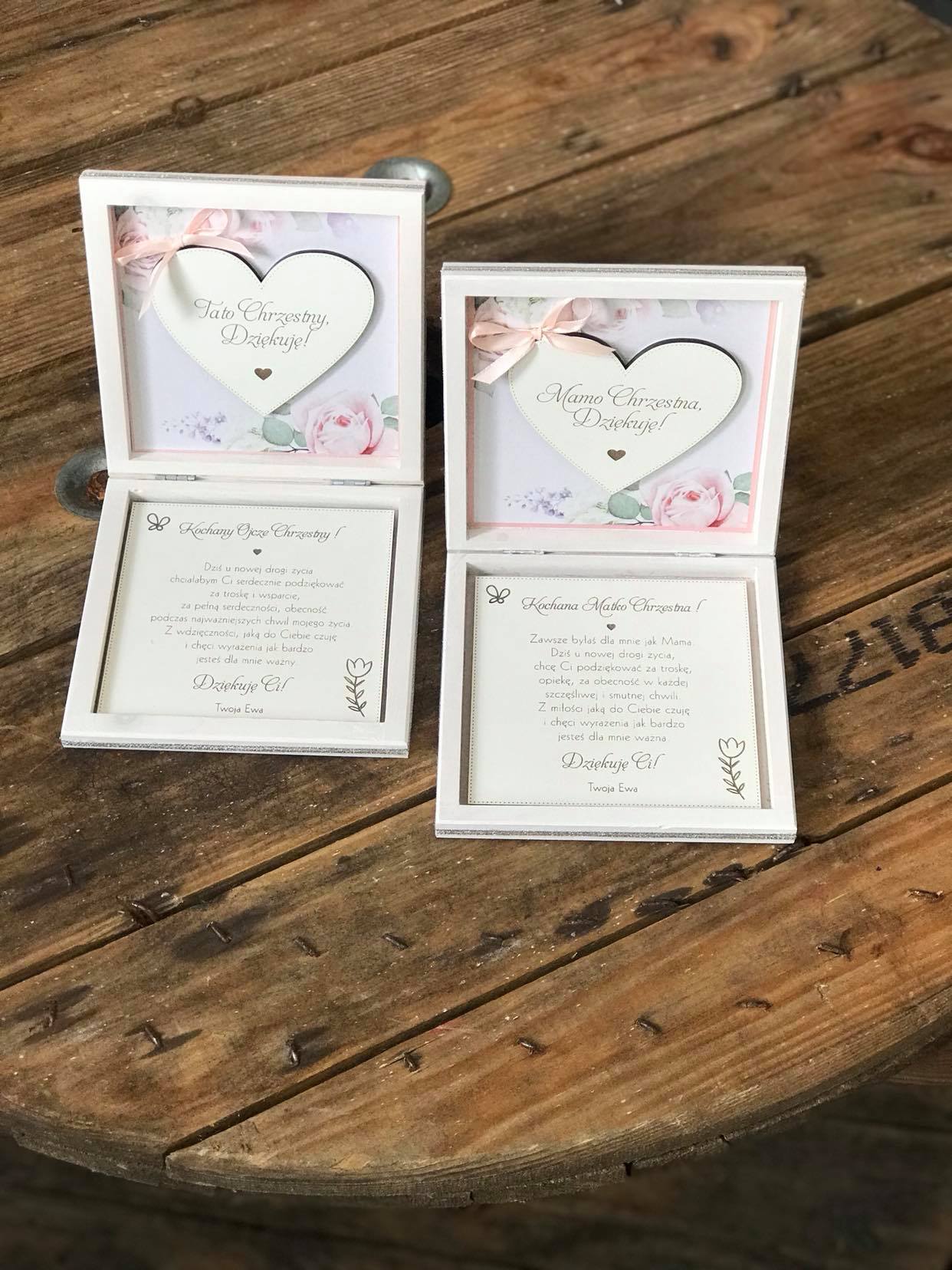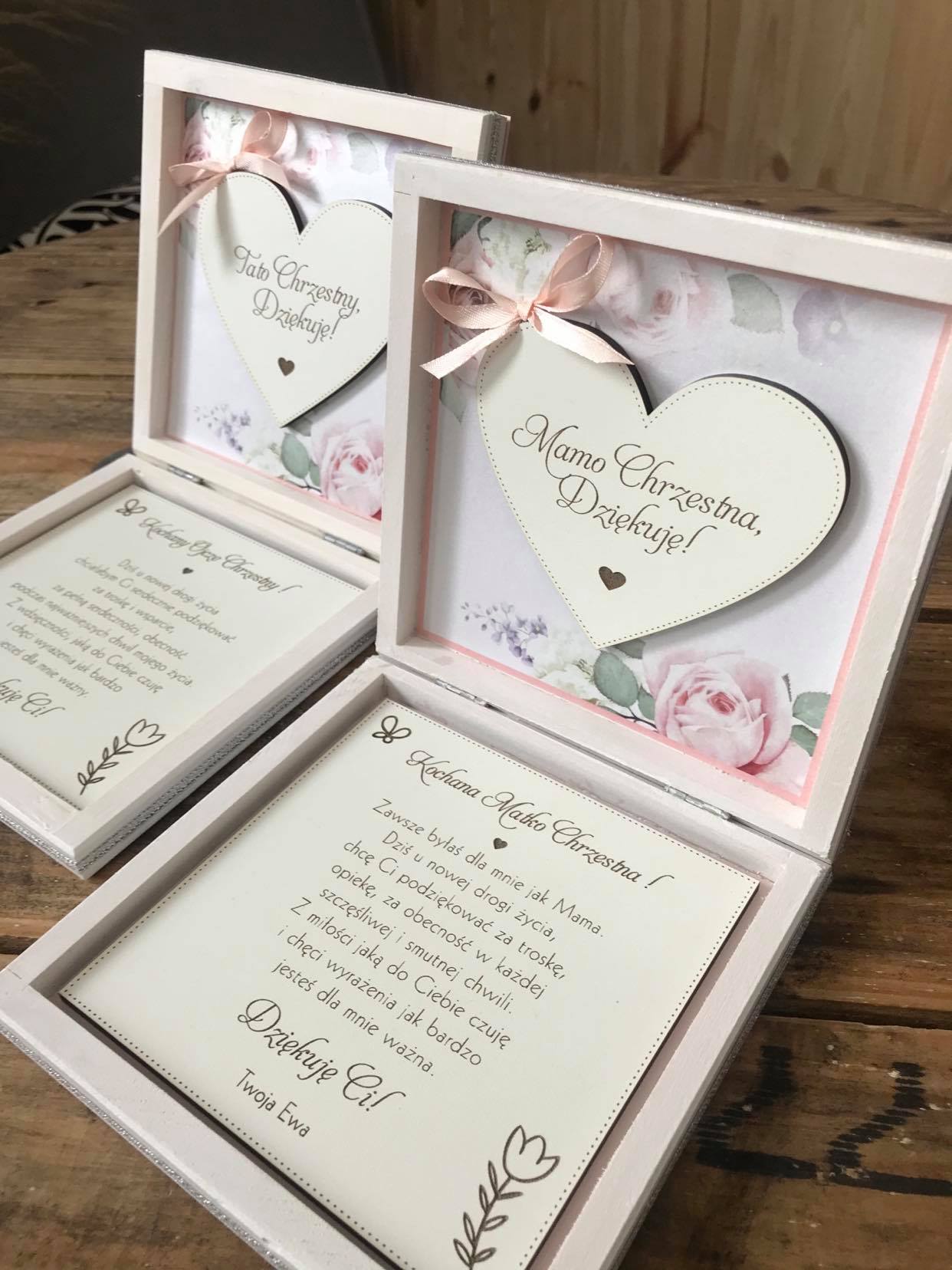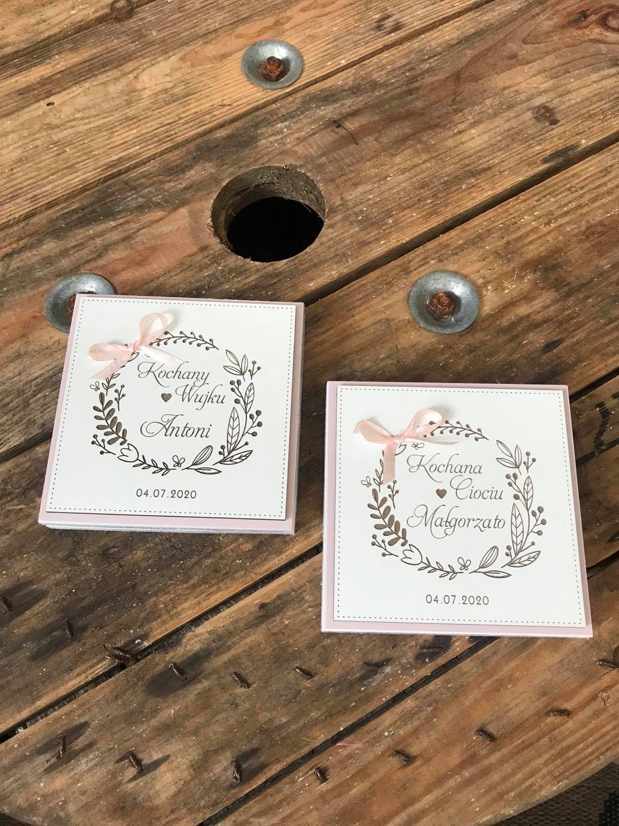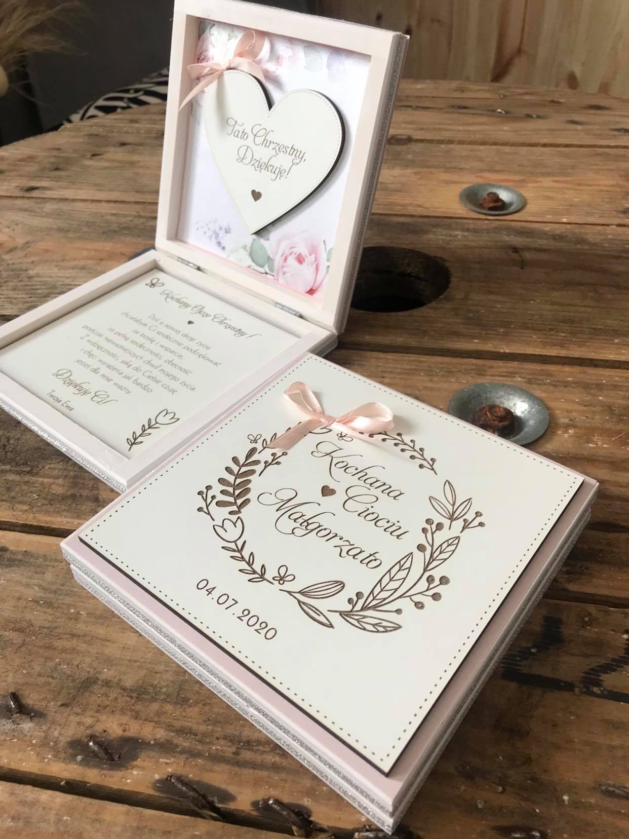 - w każdym pudełku drewniany kartka z zaproszeniem