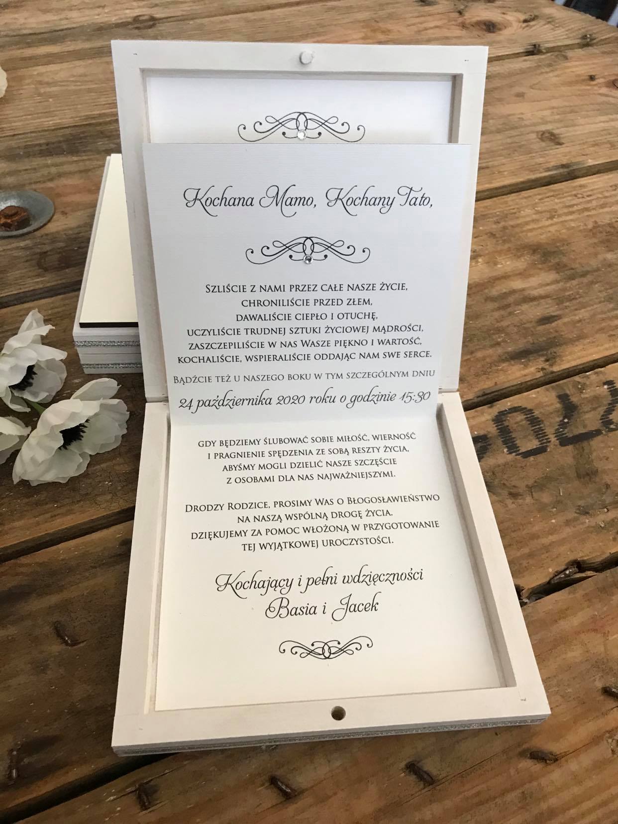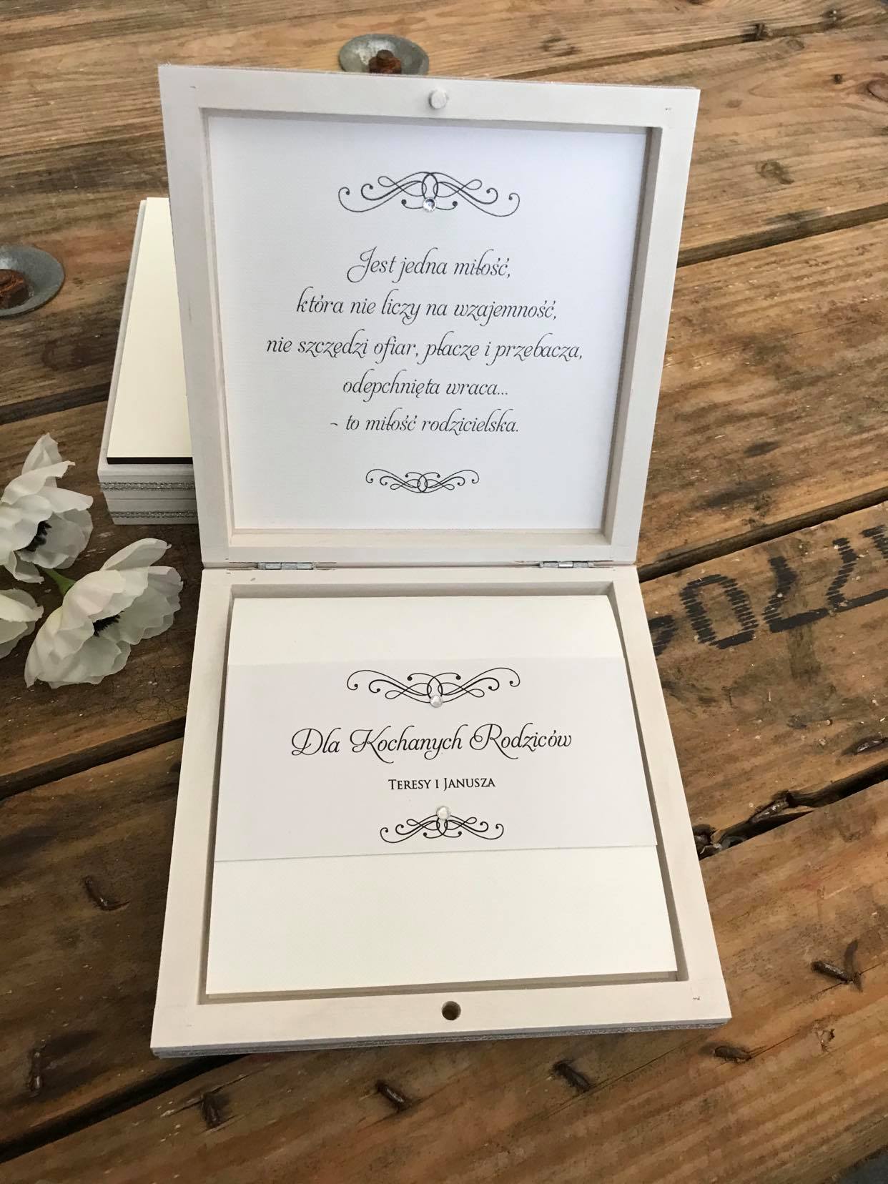 „Zaproszenie dla Rodziców w drewnie” piękne i eleganckie zaproszenia dla rodziców grawerowane, wzór zaproszeń dla rodziców dopasowywany do każdego wzoru naszych zaproszeń, kartka wewnątrz drewnianego pudełka kwadratowego to piękna i wzruszająca pamiątka.