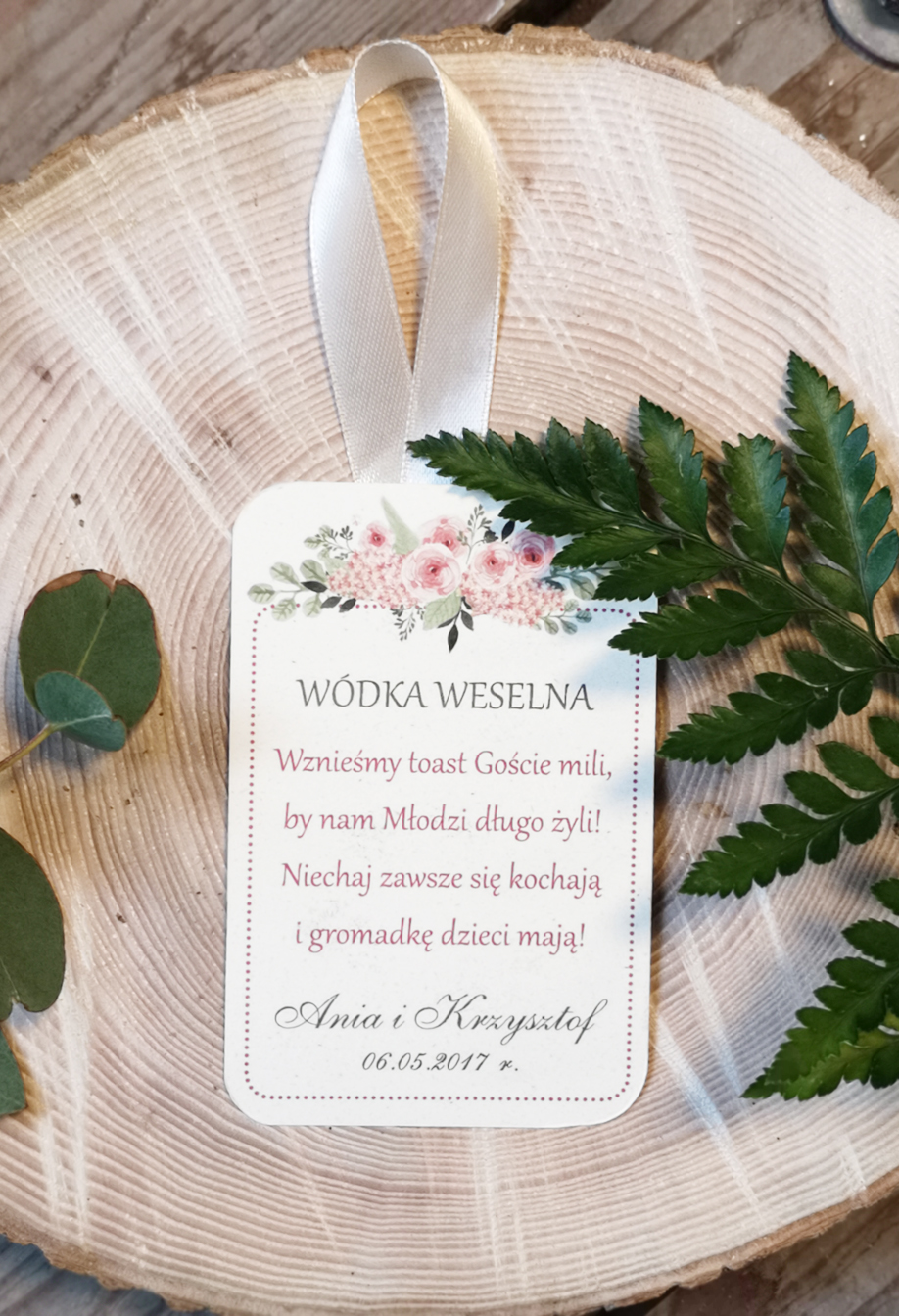 Zawieszki podłużne do serii „Eco Pieniek” z motywem kwiatów z zaproszeń, zwieńczone wstążeczką lub sznurkiem do wyboru.